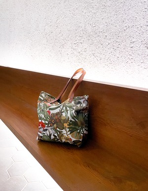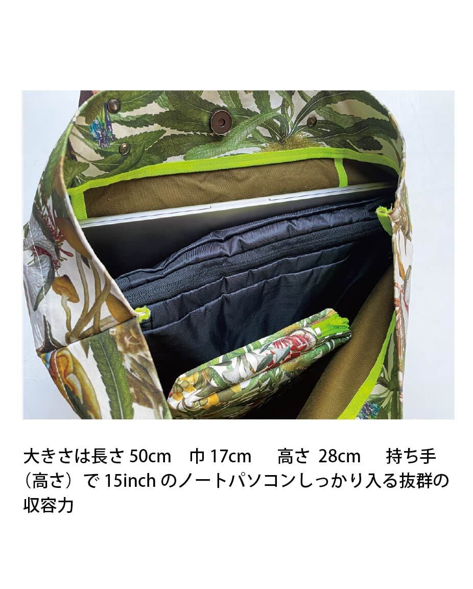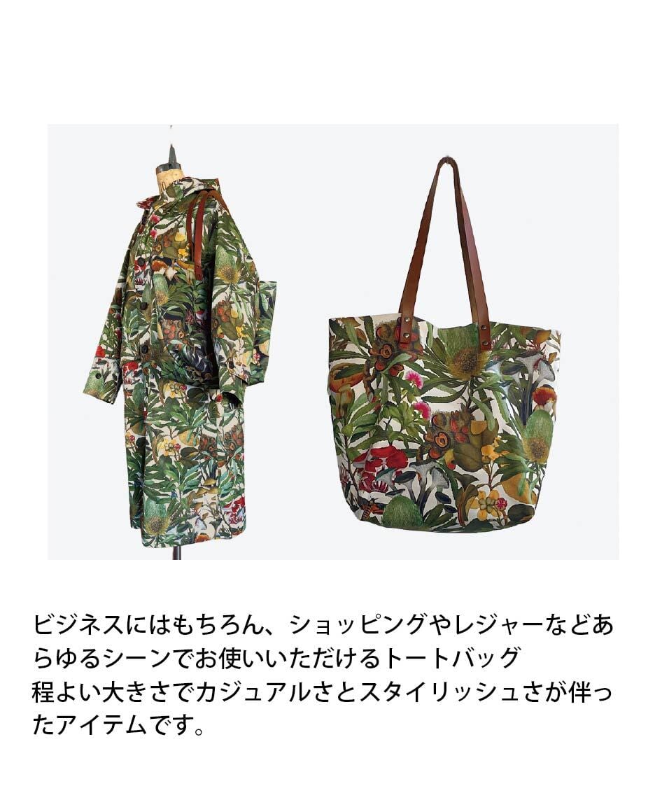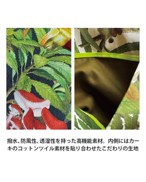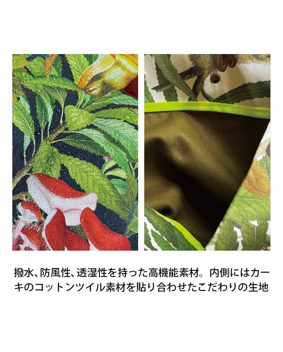 高機能ミリタリー素材を用いたボタニカル柄のトートバッグ。キノコや南半球の植物を描いたボタニカル柄