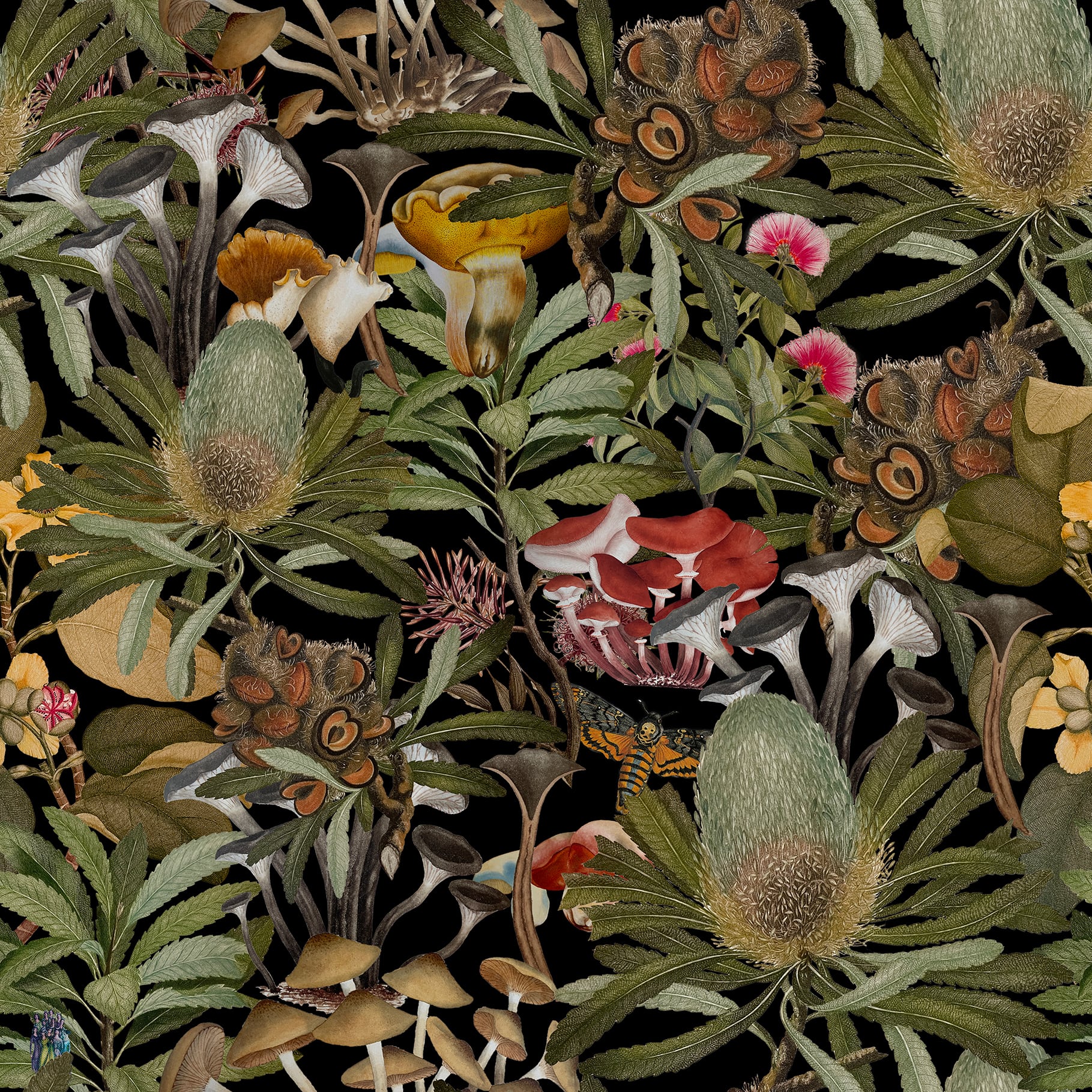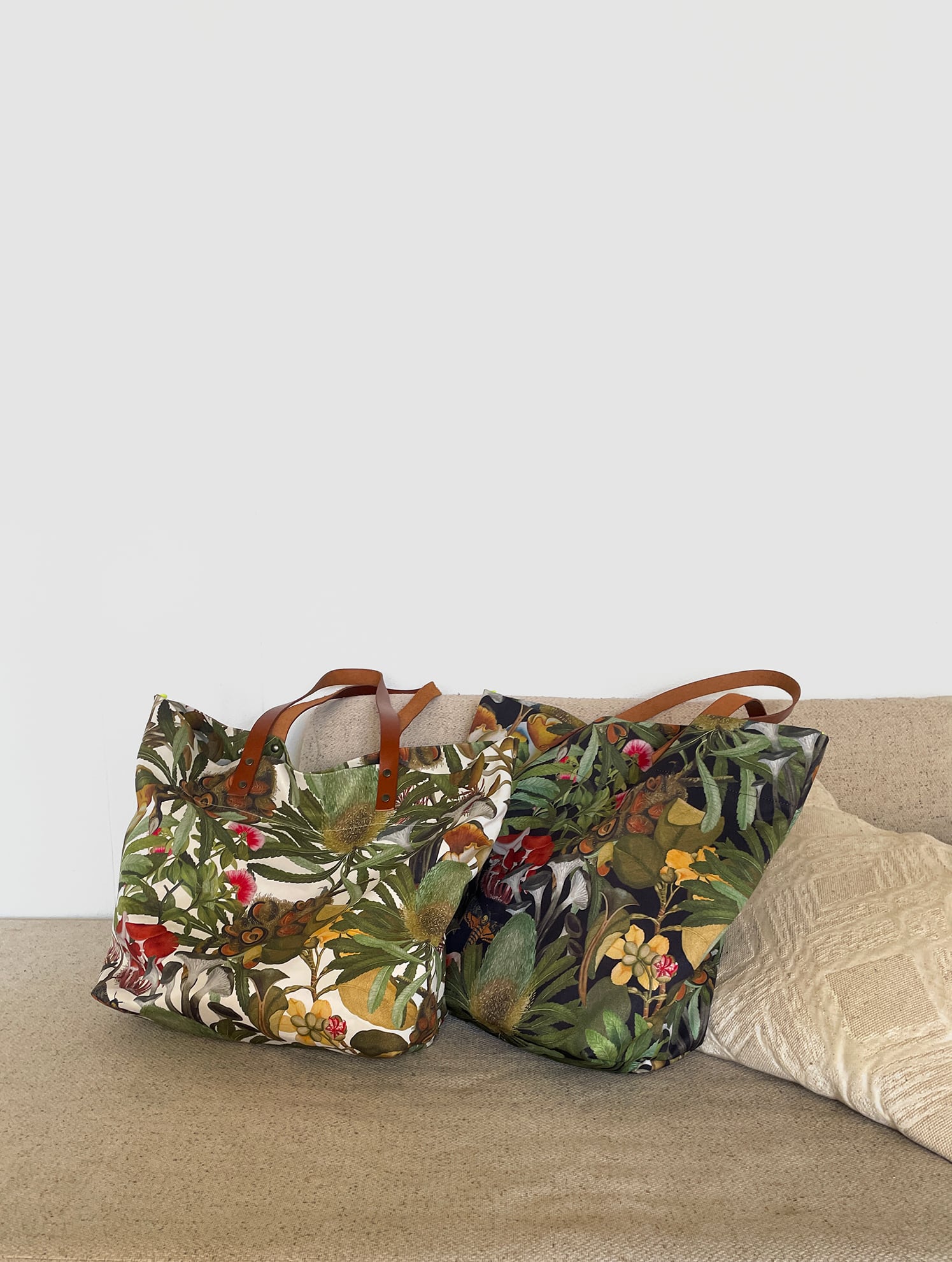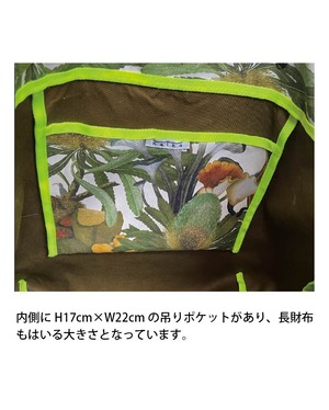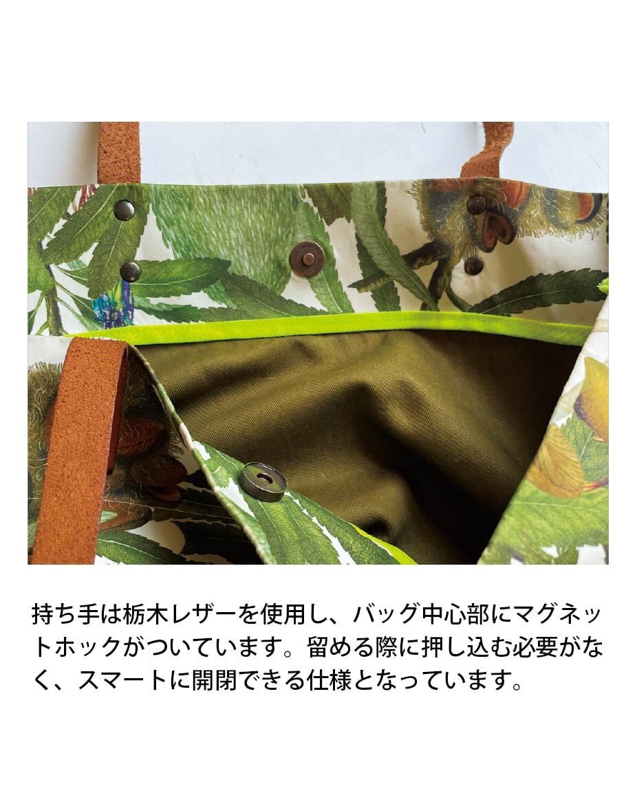 高機能ミリタリー素材を用いたボタニカル柄のトートバッグ。キノコや南半球の植物を描いたボタニカル柄