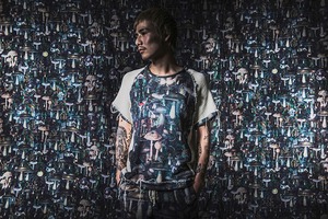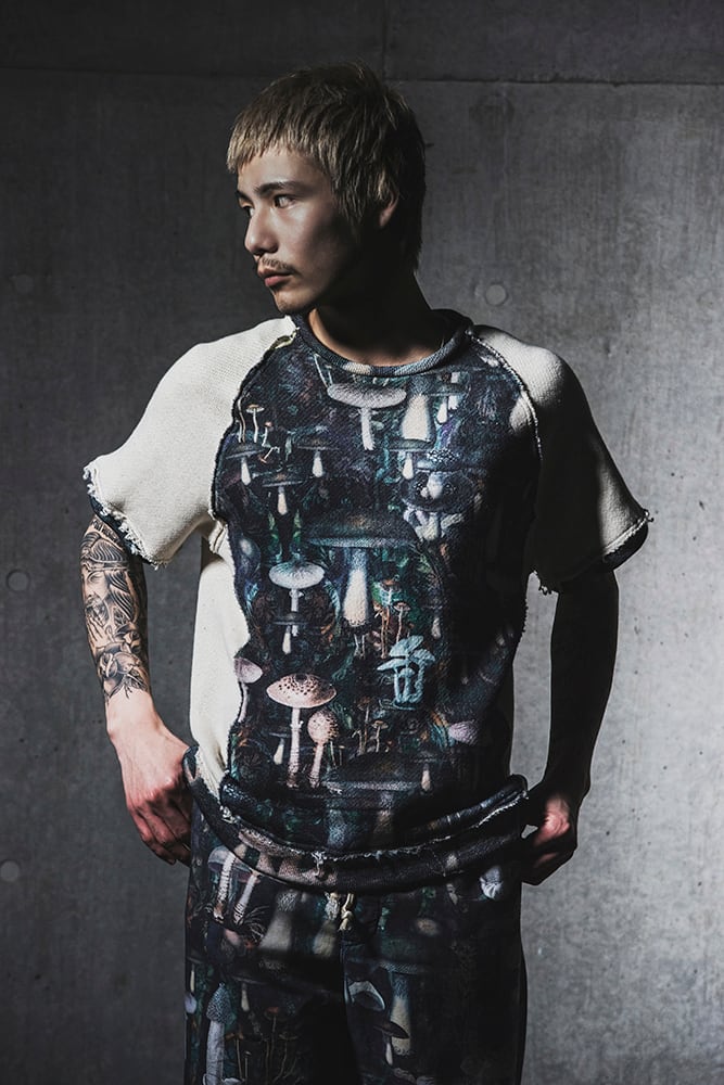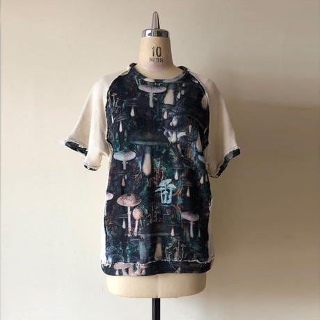 アンティーク風の様々なをキノコのモチーフ用いたグラフィックのデザインカットソー